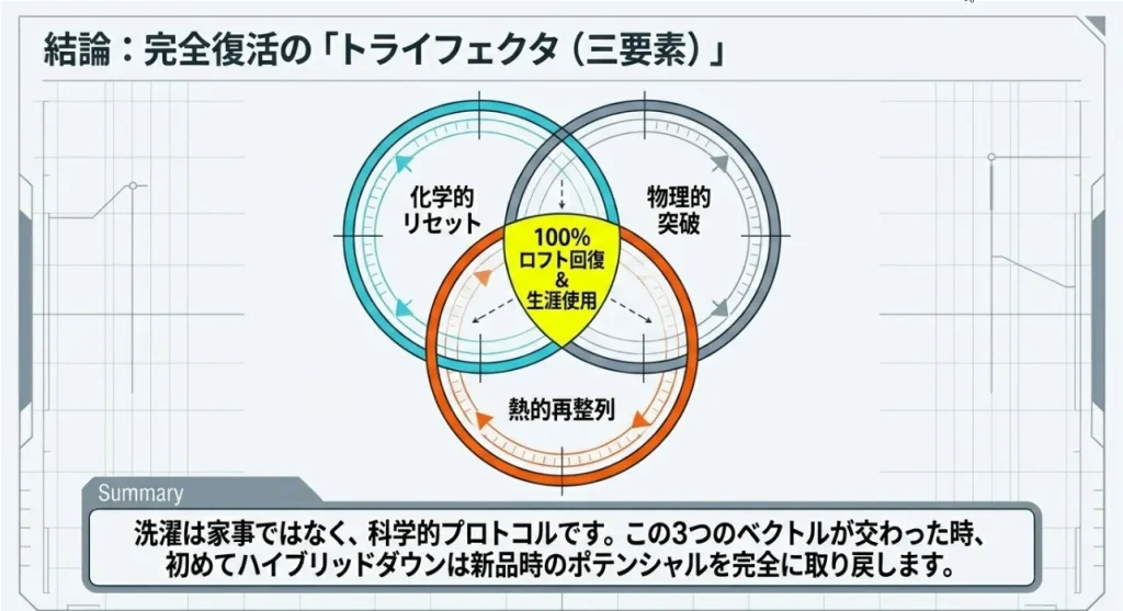 【結論】「裏返し脱水」と「乾燥機の熱」で、撥水もふくらみも完全に蘇ります