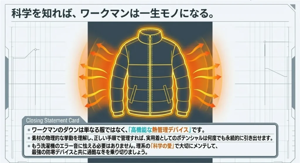 でも、日々のちょっとした汚れやぺたんこ具合なら、あなたの手で十分に直せます。科学の力で蘇ったダウンに袖を通すとき、きっと昨日よりもそのジャケットが愛おしくなっているはず。大切な一着と一緒に、これからの寒い季節も暖かく、前向きに過ごしていきましょうね。応援しています!