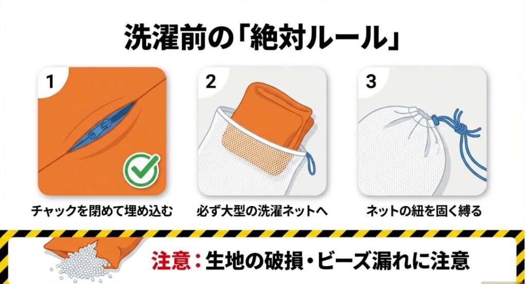 そしてもう一つ、絶対に忘れてはいけないのが「洗濯ネット」の使用です。しかも、大きめの布団用ネットを使ってください。ヨギボーのカバーは非常に面積が広いため、小さなネットに詰め込むと、洗剤が中まで浸透せず、汚れが再付着する原因になります。逆にネットを使わないと、洗濯槽の穴や突起と摩擦を起こし、部分的に色が抜ける「チョークマーク」ができてしまいます。ネットは、ヨギボーの肌触りと色を守るための防護服なんです。