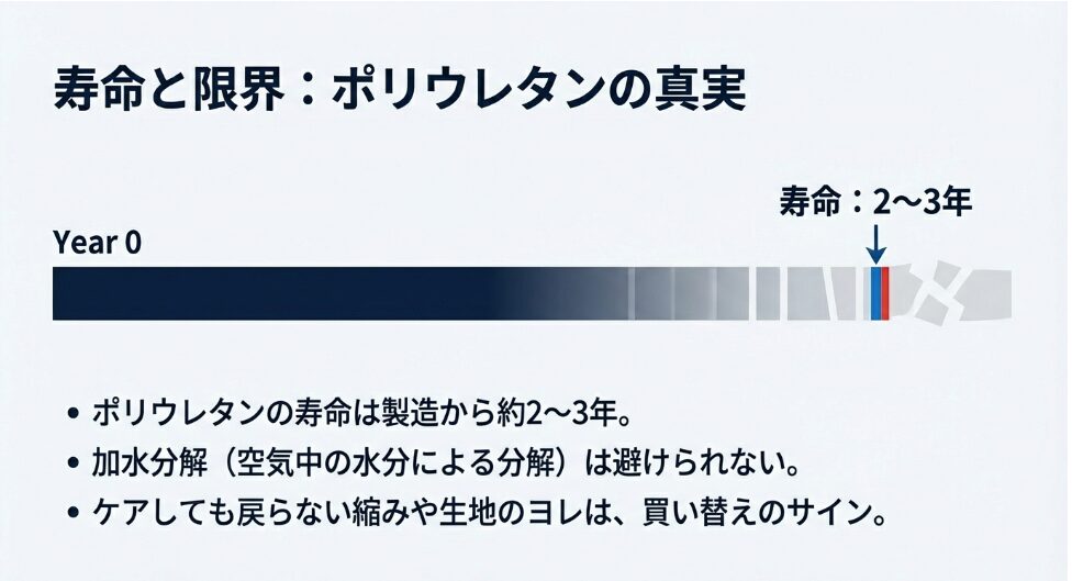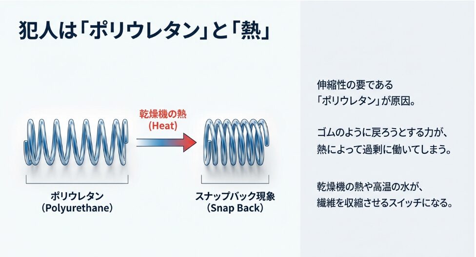 しかし、ここで注目したいのが最大23%という驚異的な「ポリウレタン」の配合率です。このゴムのような繊維は、皮脂汚れや洗濯時の強い摩擦が蓄積すると、徐々に「へたり」や「型崩れ」として現れます。