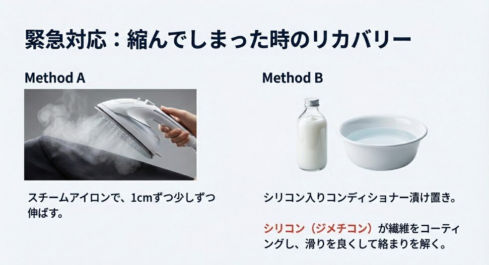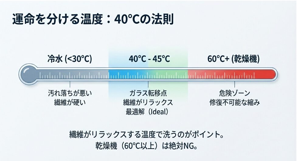 - 解決の論理:「40℃の温水」で繊維を緩め、蒸気で「形状記憶」を上書きする。