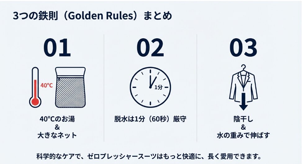 最後に、良かれと思ってやってしまいがちな「追い失敗」を防ぐお約束です。ゼロプレッシャースーツに使われているポリウレタンは熱に弱いので、直接アイロンを「プレス」するのは厳禁。繊維が溶けてテカリが出たら、もう戻せません。必ず「スチームで浮かせて」仕上げましょう。