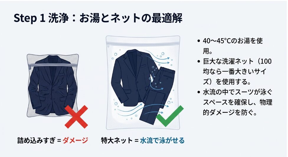 確かに、洗濯機へ「ポーン」と放り込めるのは最高に楽ですよね!でも、まったく無頓着にやればいいというものでもありません。もし「手軽だけど、なんだかシワが残るな」「もうちょっとパリッとさせたいな」と悶絶しているなら、それはあなたがこのスーツの可能性を信じている証拠です。