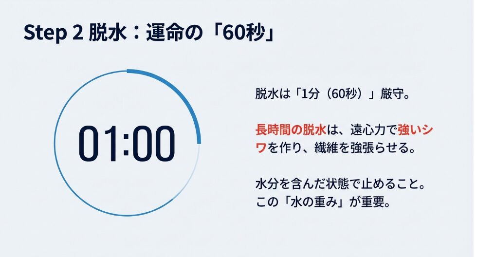 ここが最大のポイントです!洗濯機の標準コースだと脱水が長すぎて、その間に強いシワが定着してしまいます。脱水が始まったら「1分(60秒)」で手動停止。水分を少し残した状態で取り出すことで、その水の重みが「アイロン代わり」のプレス力となり、干すだけでシワが伸びてくれます。